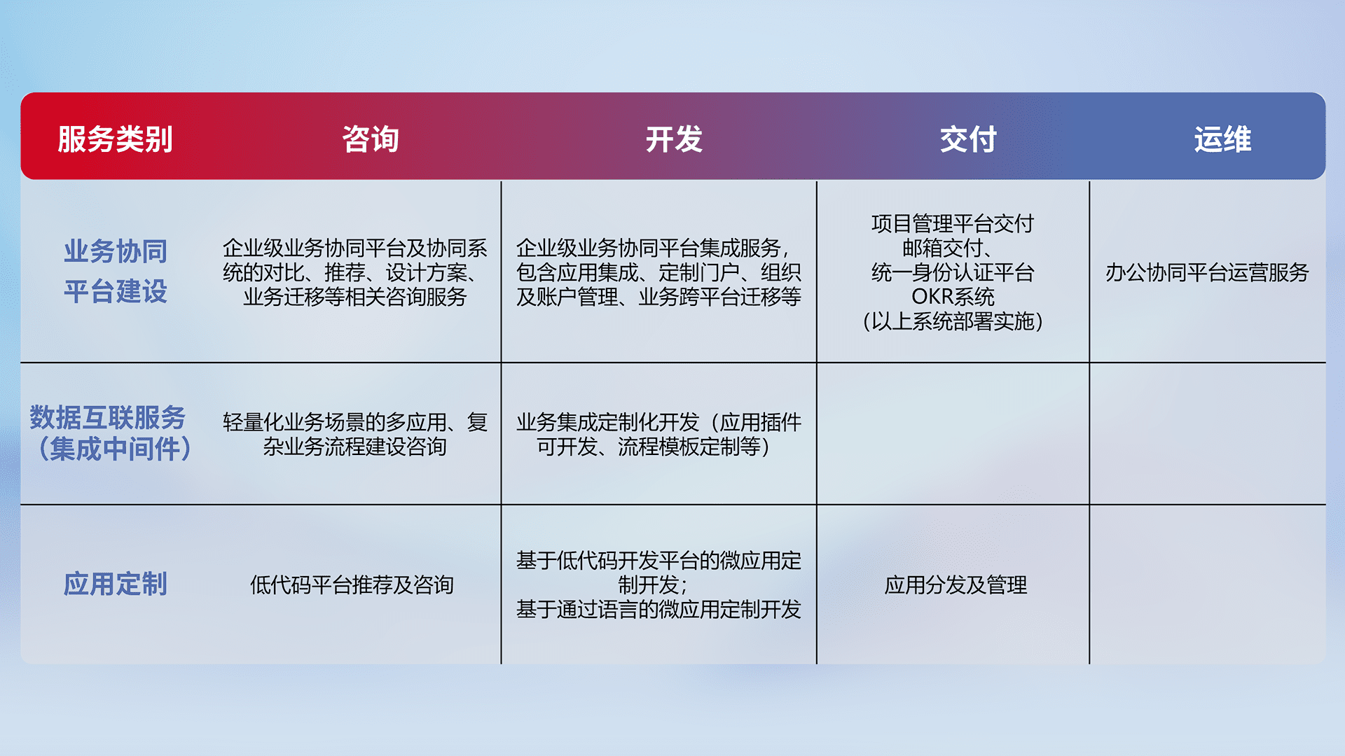 针对钉钉、、、企微、、IDaas等平台级产品提供产品的规划、、、方案、、、交付、、、、定制化开发等服务,,,实现如统一协同办公、、智能客户服务、、、、混合会议管理、、智能数据查询、、、等业务场景,,,,实现数字化转型。。